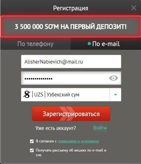 - Email — Elektron pochta orqali. Bunda elektron pochtani kiritib UZS valyutasini korsating. Songra, elektron pochtangizga Pin Up bukmekeridan kelgan xatdagi AKTIVIROVAT tugmasini bosib pochta manzilini tasdiqlang.